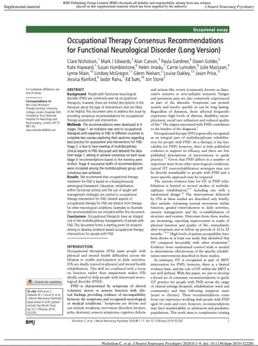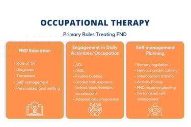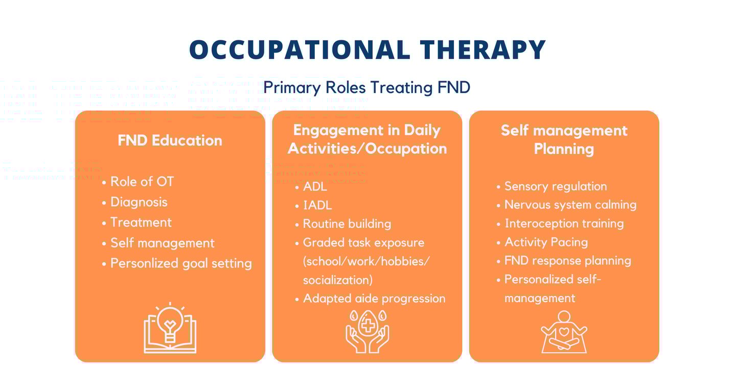 Occupational Therapists are trained in both physical and psychological interventions. Occupational therapy's history is rooted in mental health treatment and are viewed as a core member of mental health teams. This combination of training and therapeutic focus makes Occupational Therapists ideal medical professionals for the treatment of those with FND and their co-morbid symptoms. Occupational therapy utilization varies country to country, so access may vary depending on where you are located.