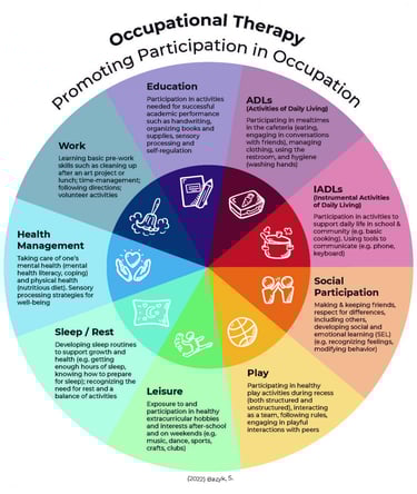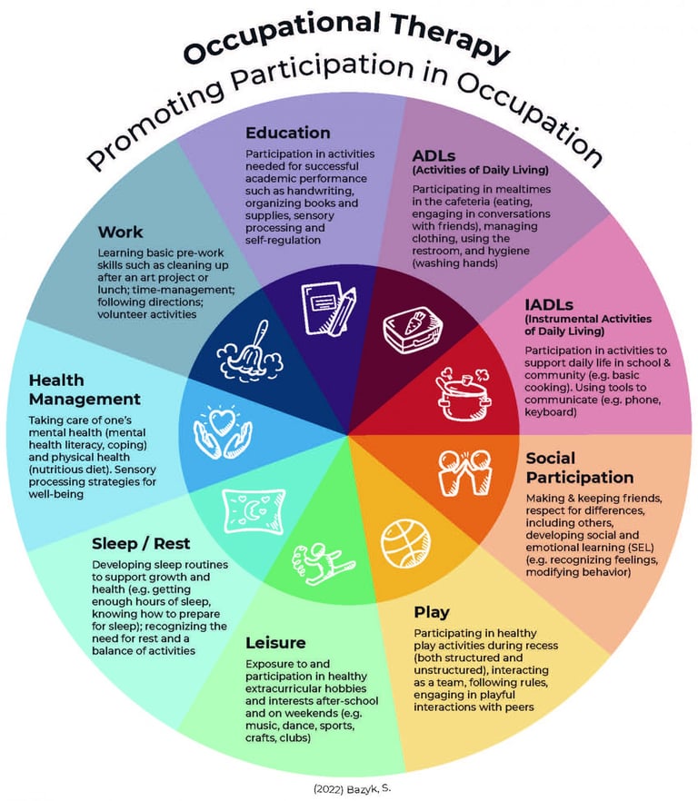 Occupational Therapists are medical professionals that work to improve a persons overall independence with activities of daily living (ADL) or instrumental activities of daily living (IADL). This is done through personalized engagement in every day functional tasks (occupations) to ensure safety, improve independence, support co-morbid diagnosis management and progress overall functioning. The term occupation refers to any task that a person completes throughout the day that brings meaning to their life (dressing, grooming, managing a home, raising a child, exercise, mobility, hobbies, work, school, etc.).